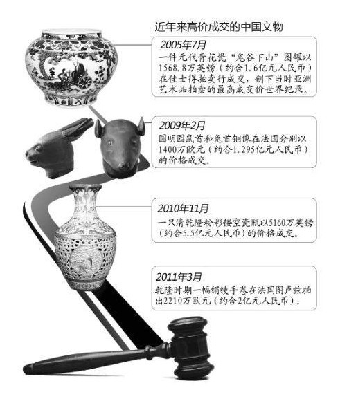 據聯合國教科文組織統計,流失到中國境外的中國文物約164萬件,分散在全世界47家博物館,海外民間的收藏預計是館藏的10倍。近年來,中國文物成了拍賣市場的搶手貨,價格動輒上千萬。