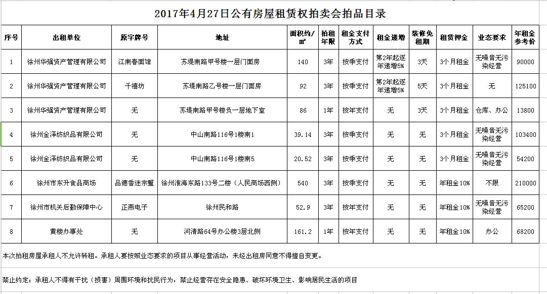 關注微信公眾號我公司受委托,定于2017年4月27日10時開始,通過中國拍賣行業協會網絡拍賣平臺(http://pm.caa123.org.cn),以網絡競價的方式公開拍賣公有房屋租賃權一批,租賃期限均為3年,以下房屋均為空房: