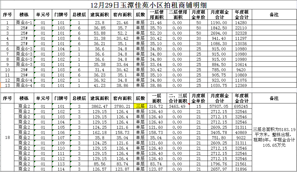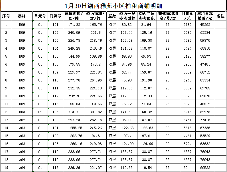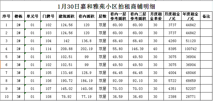 拍租門面房共有數十套,均為空房,房屋面積分別為數十至數百平方米不等。租賃期限均為3年。