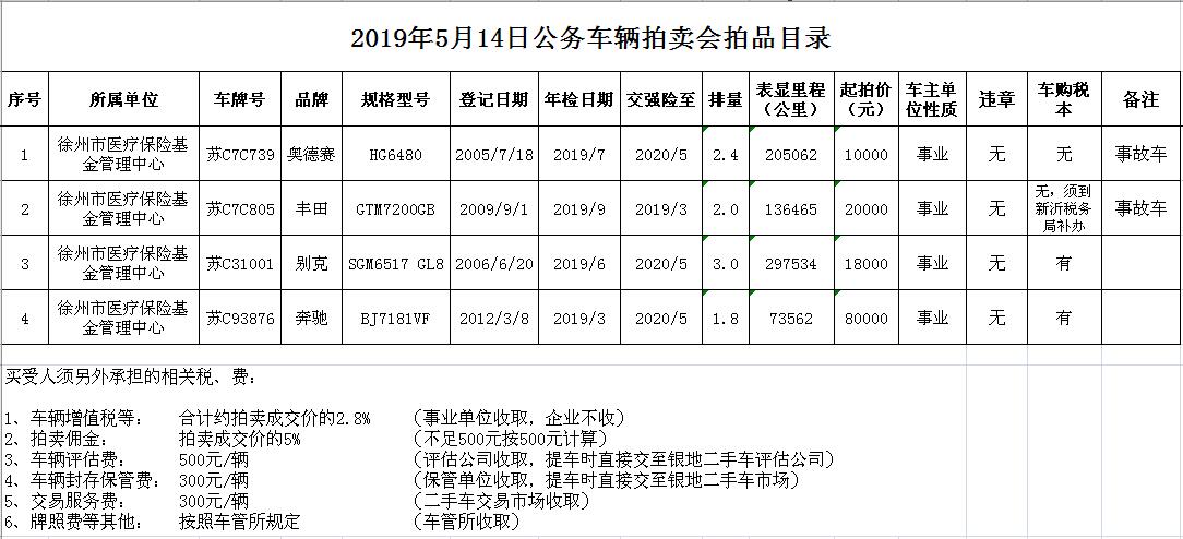 關注微信公眾號受委托,我公司定于2019年5月14日10時在徐州市中山南路55號本公司拍賣廳通過現場和中國拍賣行業協會網絡拍賣平臺結合拍賣的方式公開拍賣以下車輛: