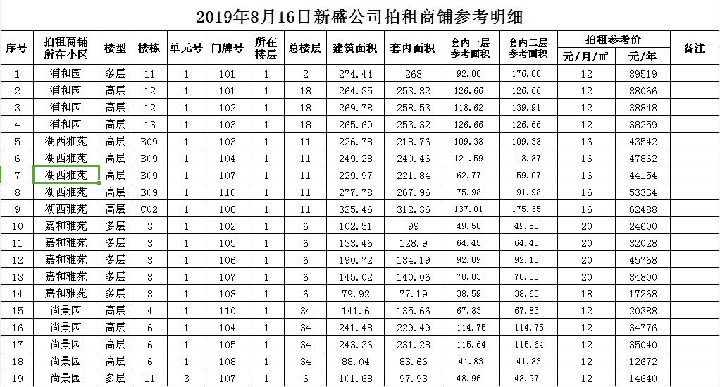 湖西雅苑、尚景園、潤和園、嘉和雅苑等。商鋪共19套,均為空房,面積分別為80至300平米不等。租期3年。