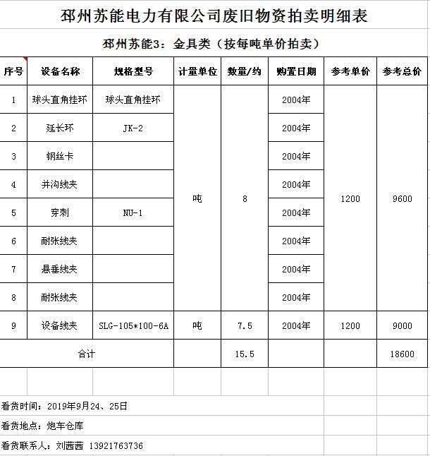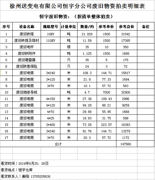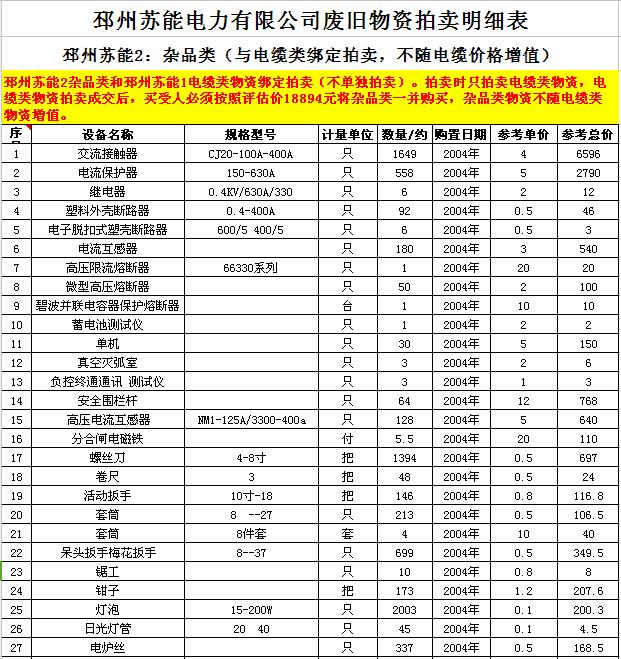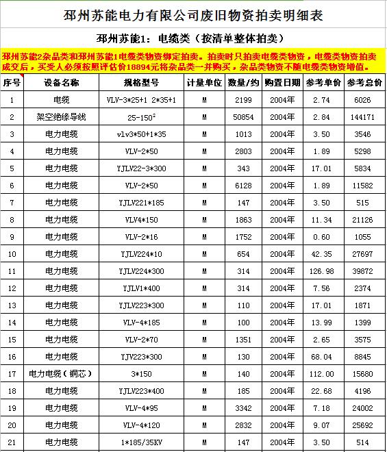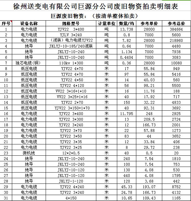關注微信公眾號受委托,我公司將通過中國拍賣行業協會網絡拍賣平臺以網絡競價的方式公開拍賣廢舊電力物資一批,主要包括:電纜、導線、廢舊鋼材、鋼芯鋁絞線、金具、雜品、機具、空調、辦公設備等。