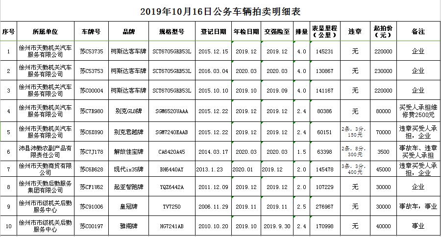 關注微信公眾號受委托,我公司定于2019年10月16日13:00時在徐州市銀地二手車交易市場四樓東南拍賣大廳通過現場和汽車街網絡拍賣平臺同步進行的方式公開拍賣以下公務車輛: