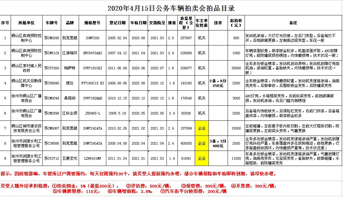 關注微信公眾號受委托,我公司定于2020年4月15日13:30時在徐州市銀地二手車交易市場四樓東南拍賣大廳通過現場和汽車街網絡拍賣平臺同步進行的方式公開拍賣以下車輛:①05年蘇CM0288君越;②07年蘇CM5129江淮瑞風;③11年蘇C5726G帕薩特;④10年蘇CM6067君越;⑤08年蘇C38586君越;⑥11年蘇C53712五菱宏光;⑦08年蘇C5609G捷達;⑧10年蘇CM0049桑塔納;⑨05年蘇CM2898江鈴全順。