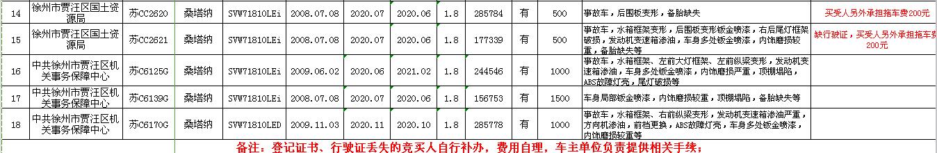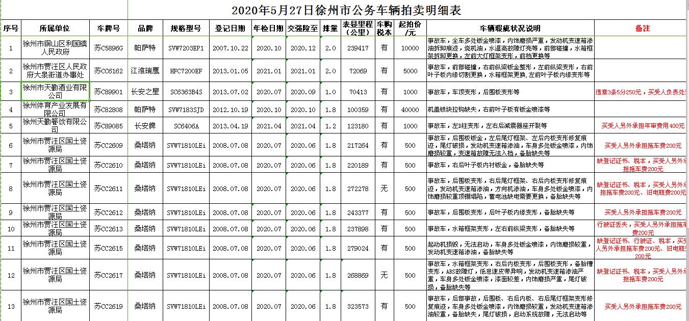 關注微信公眾號受委托,我公司定于2020年5月27日13:00時在徐州市銀地二手車交易市場四樓東南拍賣大廳通過現場和汽車街網絡拍賣平臺同步進行的方式公開拍賣以下公務車輛: