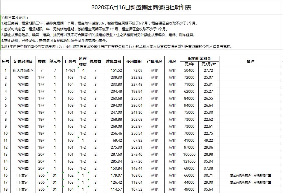 即日起展示。有意者請攜帶有效證件至我公司辦理報名手續,并交納每間商鋪2萬元競拍保證金即可參加拍賣會,報名截止至6月15日16時。