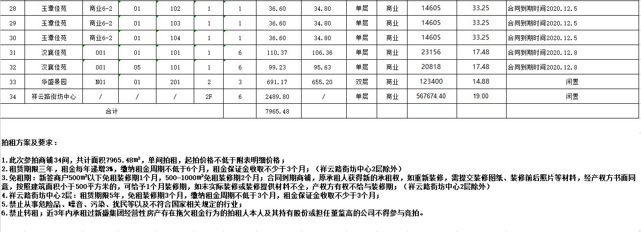 即日起展示。有意者請攜帶有效證件至我公司辦理報名手續,并交納競拍保證金即可參加拍賣會(商鋪保證金每間2萬元,華盛景園保證金5萬元,祥云路街坊中心二層保證金10萬元),報名截止至11月2日16時。
