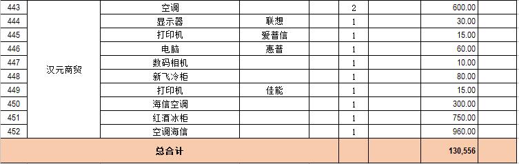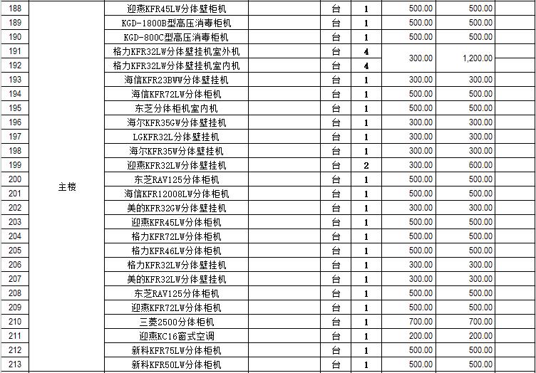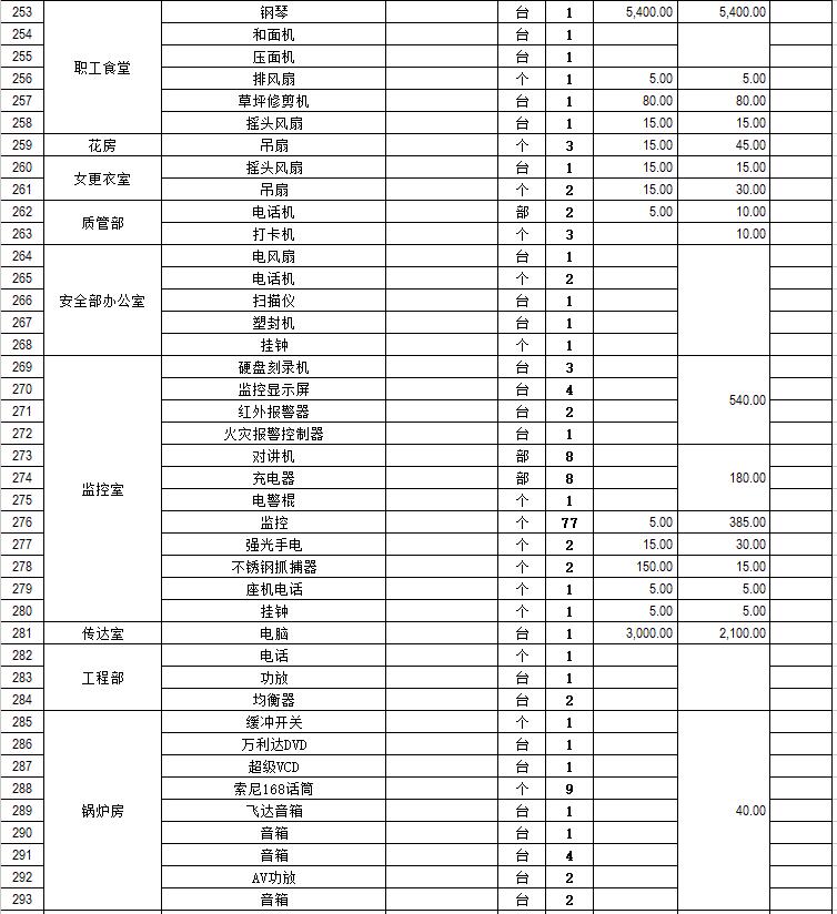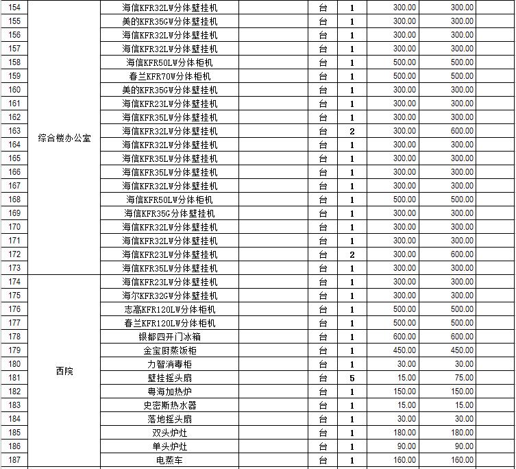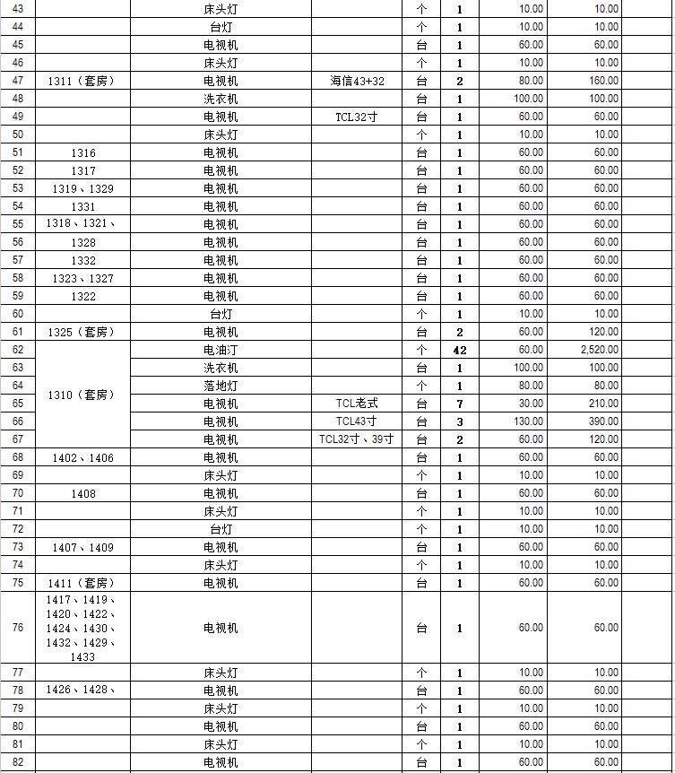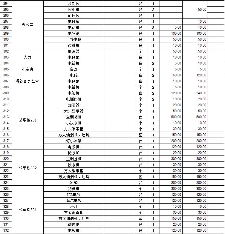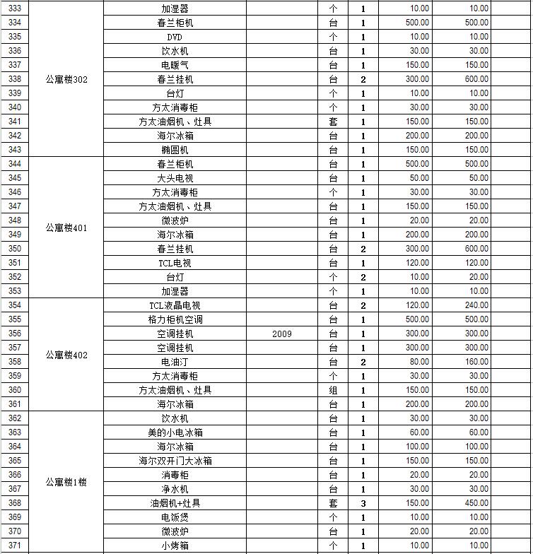 電器設備主要包含:電視機、空調、冰箱、消毒柜、電風扇、燈具、電腦、音響設備、廚房不銹鋼灶具等。
