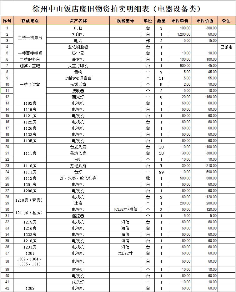 關注微信公眾號我公司受委托,定于2021年1月18日10時在中拍平臺通過網絡競拍方式公開拍賣:徐州市中山飯店、漢元商貿公司廢舊物資一批,主要包括廢舊電器設備、酒店用具等。