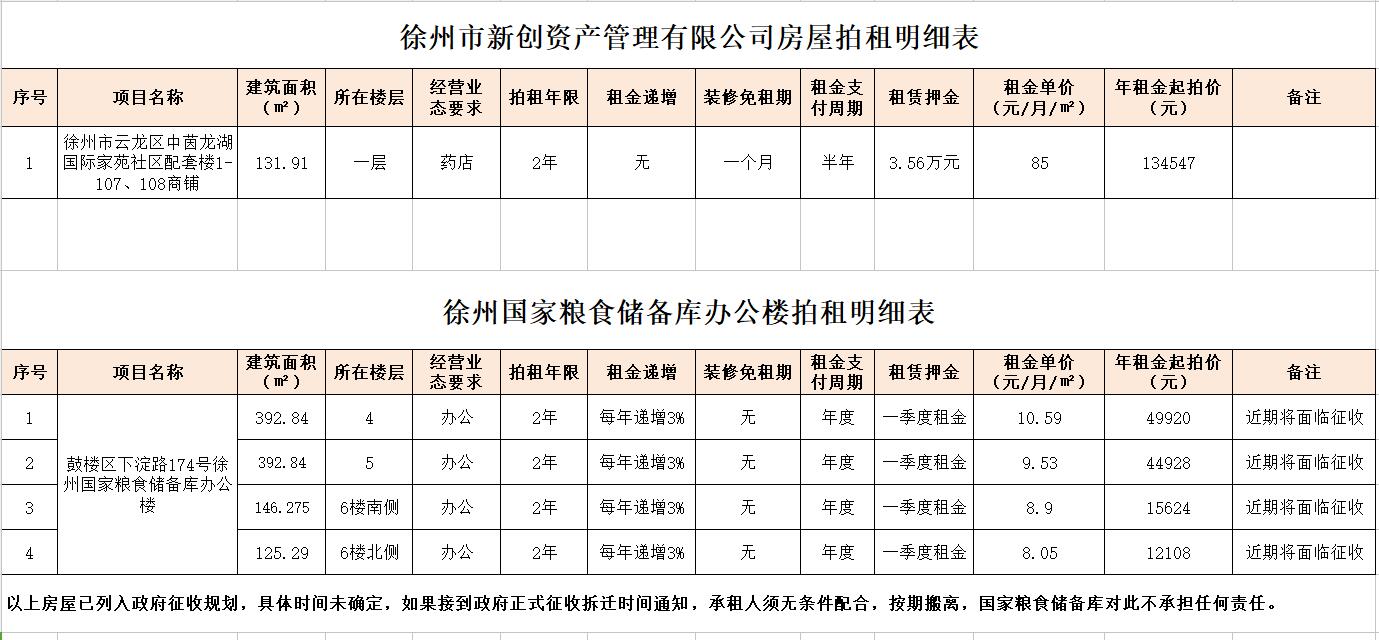 1.云龍區中茵龍湖國際家苑社區1-107、108商鋪,建筑面積131.91㎡。(租期2年,僅限經營藥店。保證金2萬元,須交至徐州市公共資源交易中心賬戶)