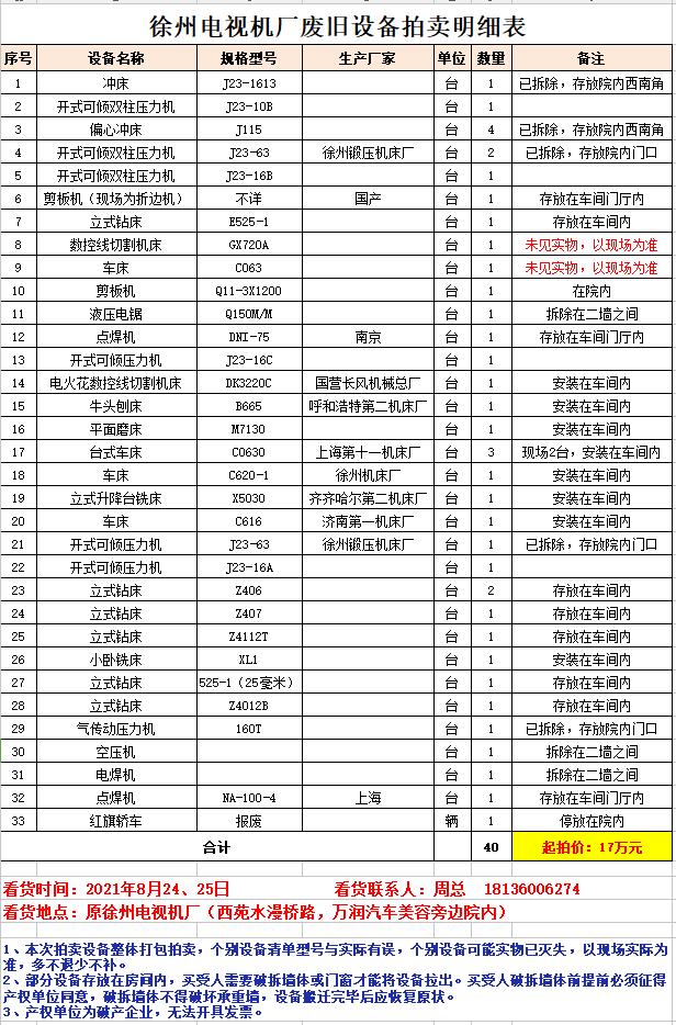 1、徐州電視機廠廢舊設備一批。包含:沖床、壓力機、折邊機、鉆床、機床、車床、刨床、磨床、銑床等、空壓機、電焊機等。(競買人須為具有再生資源回收資質的企業法人),拍賣參考價17萬元。保證金5萬元。